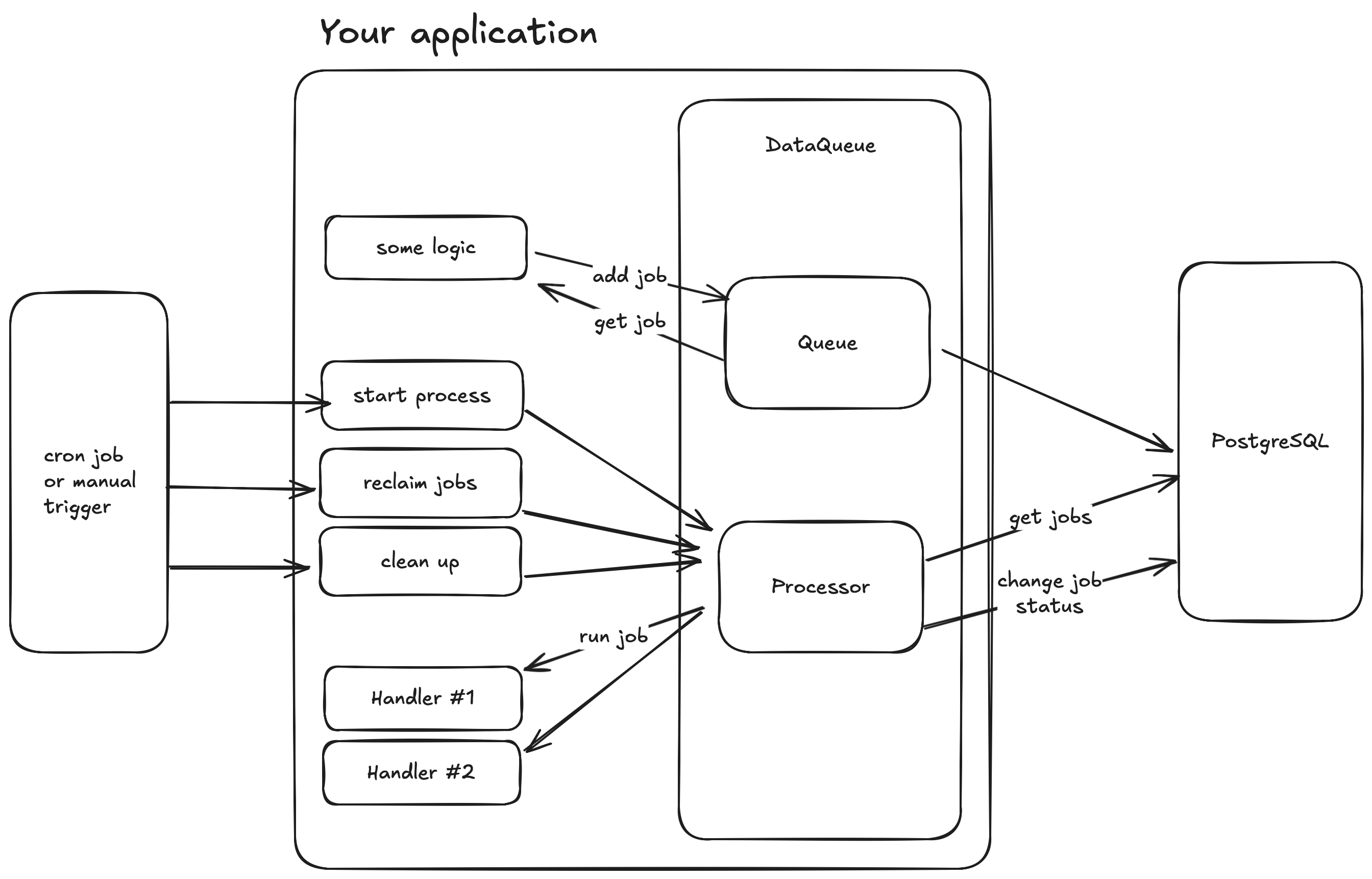 DataQueue is a lightweight library that helps you manage your job queue using a PostgreSQL or Redis backend. It has three main components: the processor, the queue, and the job. It is not an external tool or service. You install DataQueue in your project and use it to add jobs to the queue, process them, and more, using your own existing database.